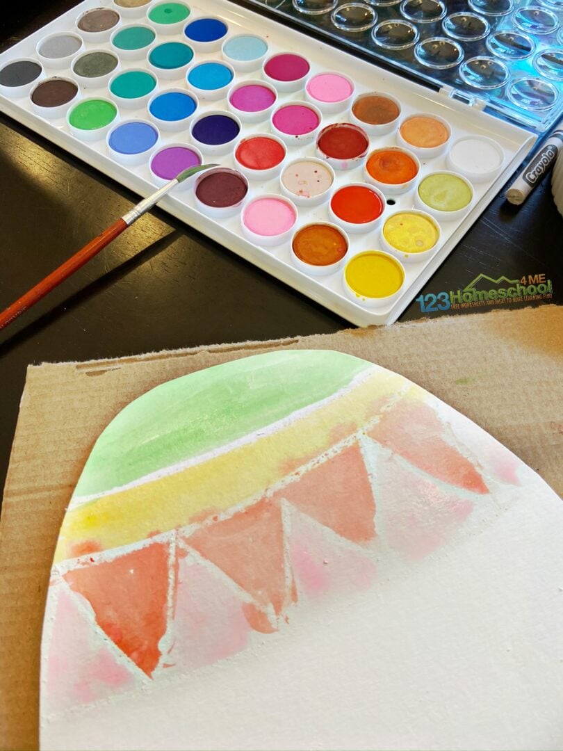 Create vibrant Easter egg art by drawing designs with a white crayon on paper eggs, then painting over them with watercolors to reveal stunning resist patterns.